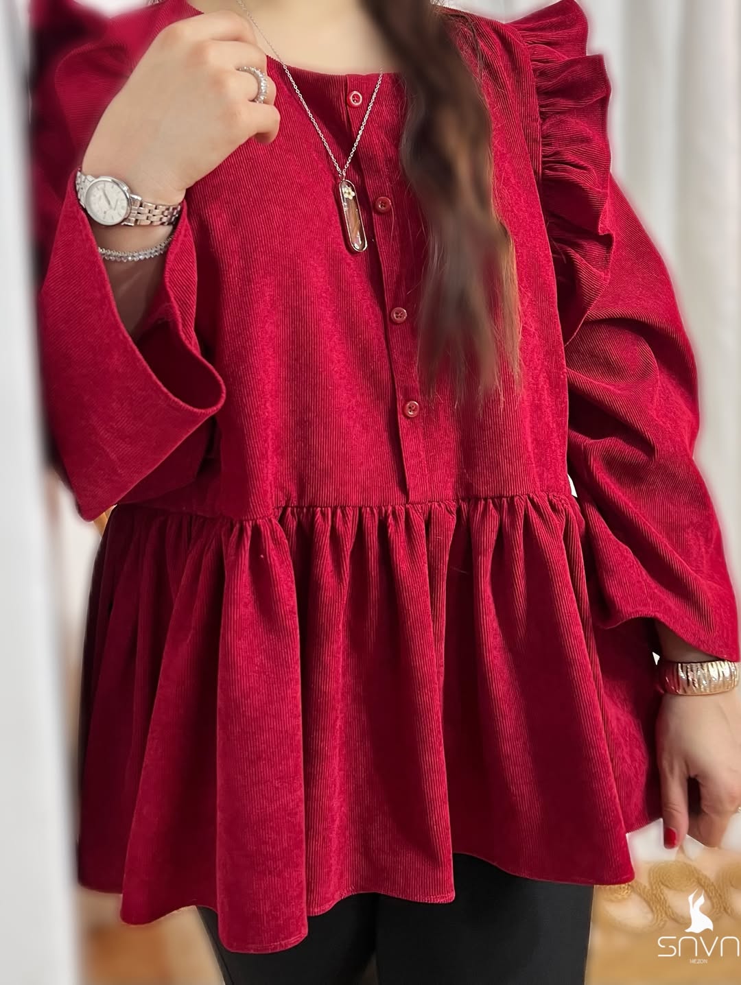 شومیز یاقوت از اون لباساست که نه داد میزنه، نه توضیح اضافه میخواد… خودش کارشو میکنه. مخمل کبریتی گرم و نرم قد حدوداً ۷۰.