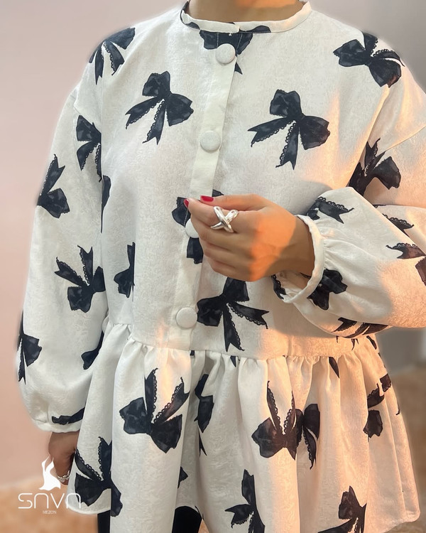 شومیز ویولت با پارچه ژاکارد و طرح پاپیونهای مشکی، آستین پفی خوشفرم و یقه گرد مینیمال، مناسب استایل رسمی و روزمره و ایدهآل برای چهار فصل.
