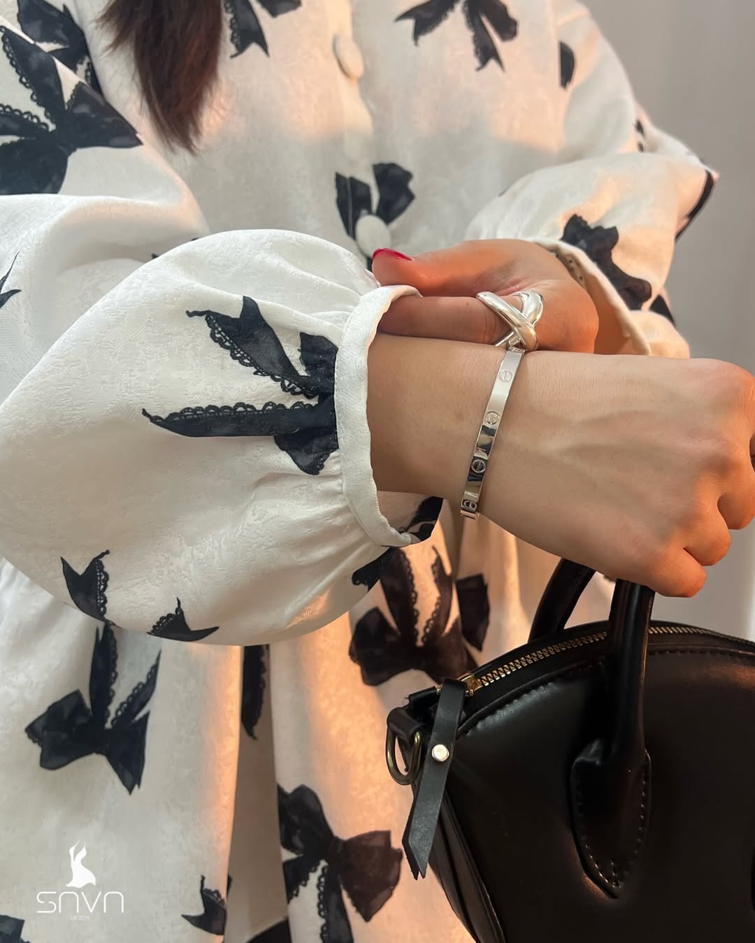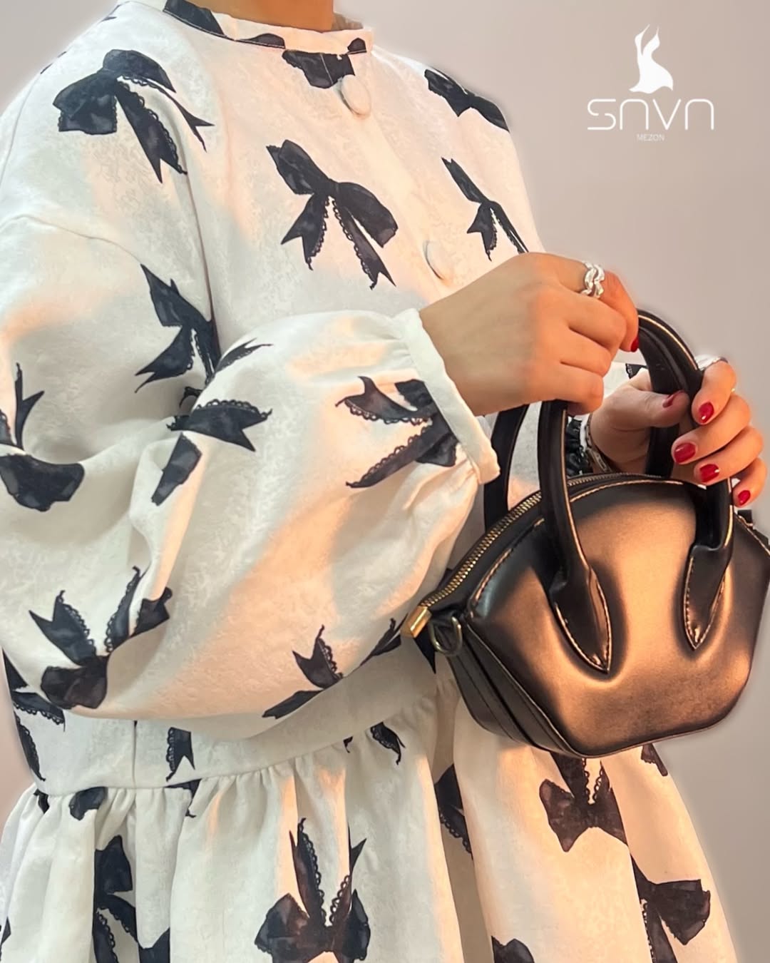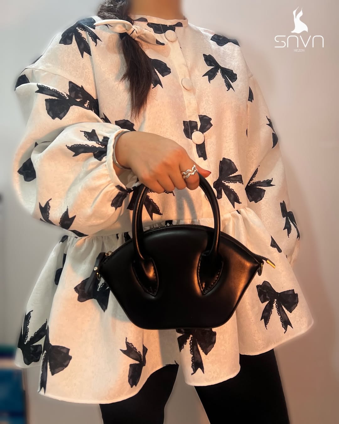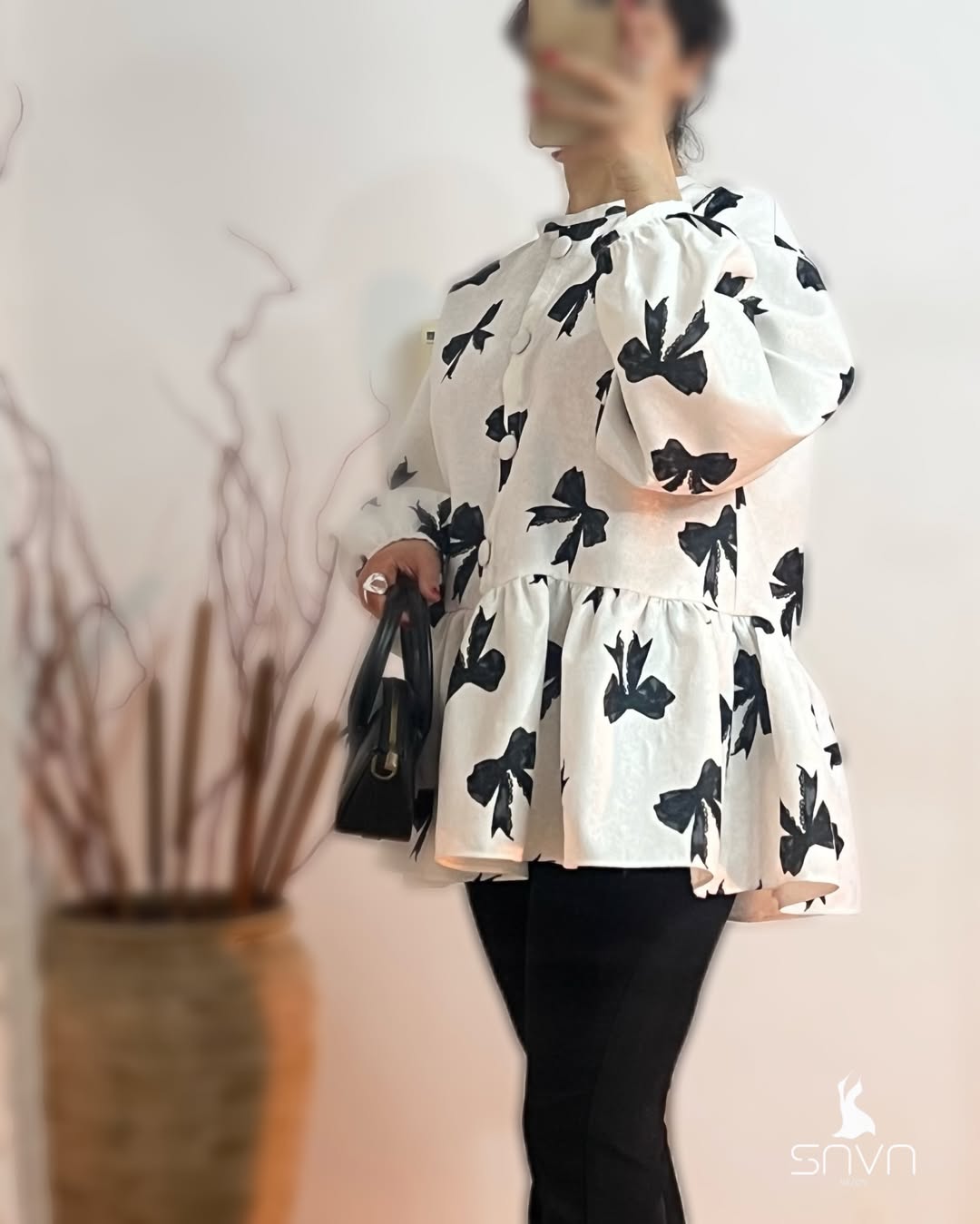 شومیز ویولت با پارچه ژاکارد و طرح پاپیونهای مشکی، آستین پفی خوشفرم و یقه گرد مینیمال، مناسب استایل رسمی و روزمره و ایدهآل برای چهار فصل.
